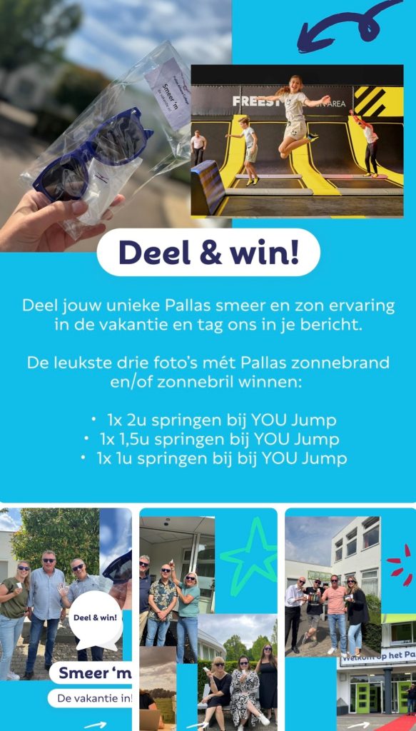 Wat dan? De leukste drie foto’s mét Pallas zonnebrand en/of zonnebril winnen: 1x2u springen bij YOU Jump Ede, 1x 1,5u springen of 1x1u springen bij Trampolinepark YOU JUMP!
