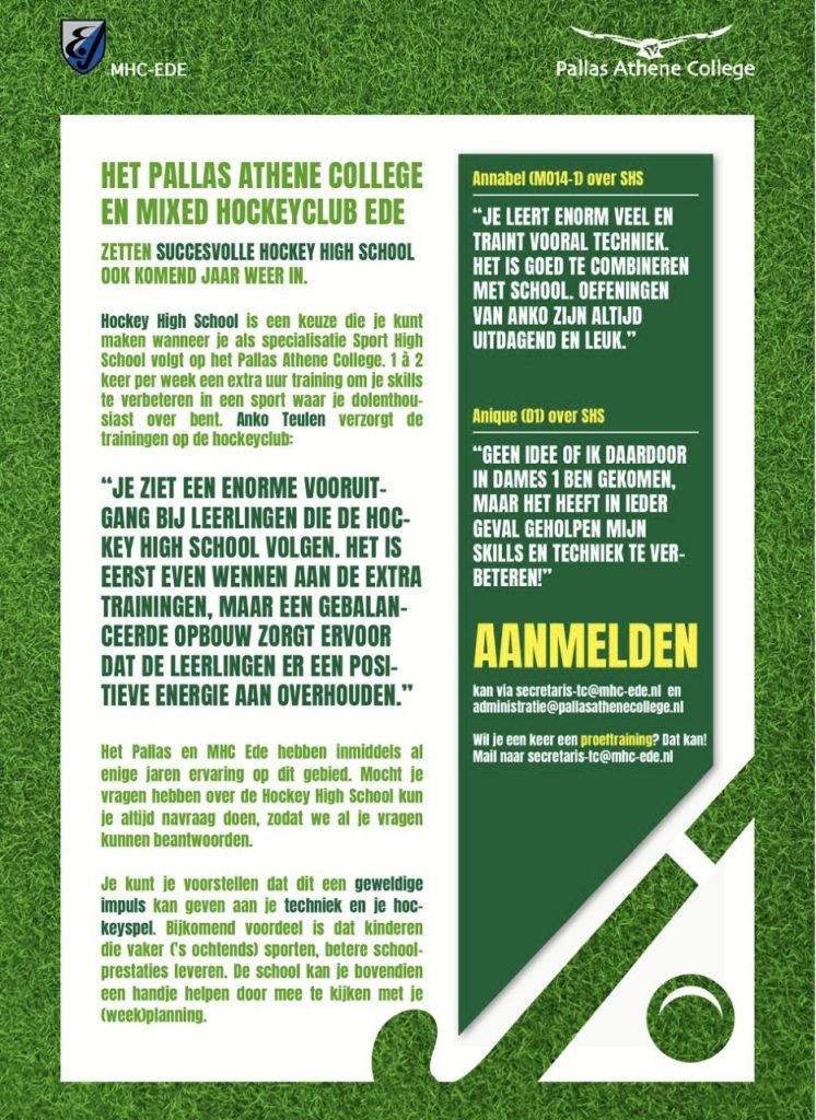Het Pallas Athene College en Mixed hockeyclub Ede zetten succesvolle hockey high school ook komend schooljaar weer in. Dit is een keuze die je kan wanneer je als specialisatie Sport High School volgt op het Pallas Athene College.